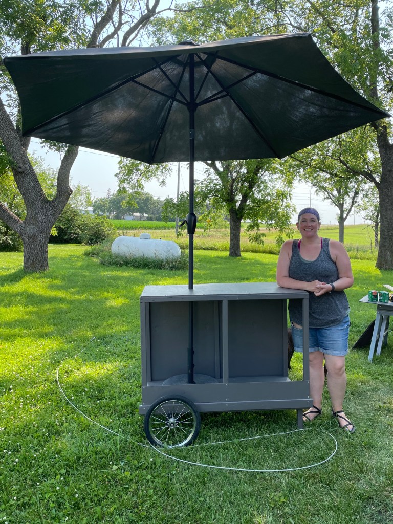 So, last year, I came up with the idea of building myself an umbrella cart. I honestly don’t even remember if it was pre-pandemic that I had the idea, or if it was after COVID had already hit my area, but I sat down with my planner, and in those pages at the back that nobody ever uses, I started sketching out what I wanted. Because I didn’t just want to be able to move my patio umbrella around–if I was going to build something I wanted it to be useful for other things too. So, I designed a thing that would look (and function) a lot like a hotdog stand you might see in a big city. But instead of having an opening in the top, with salty sausages inside, it would have a flat top, so I could stand outside and use it as a table if I want, and doors on the sides that open to an area with shelves where I can keep my pruners, trowel, watering cans, and other gardening accoutrement. This way, I can take all the things around with me wherever I want to be working outside.