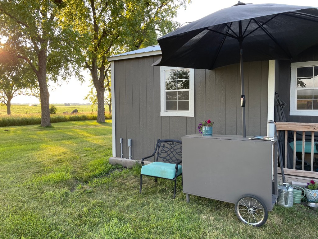 As is my usual way, I had a grand plan, bought most of what I would need to build it, started working on it, and then let life get in the way. I wanted to have it finished to use last summer, but I only got as far as buying the wood, sawing most of it into the roughly the right sizes, choosing a paint color, buying the paint, and painting about half of the pieces. Then fall/winter hit, when I didn’t need to worry so much about getting sunburned. So, I put all the pieces inside our Quarantine Cabin, where they took up space for several months. About the time it started getting nice enough outside to start working on it again, I got the dreaded virus, and didn’t have energy to work on it when I was home from work for two weeks. But, after I recovered, I started working on it from time to time. And, even though it’s still not completely finished (I haven’t gotten the handles and doors on, or the shelves put in), it now functions as an umbrella cart. I finally got the wheels on last Saturday, and that evening, The Bearded One and I sat outside and watched various fireworks shows from our backyard. So I moved the umbrella cart back there so we had somewhere to set the Thermacell (mosquito repellant thing) and our drinks. I’ve also used it as a potting table, somewhere to stand and eat my lunch, and, of course, I’ve cranked the umbrella up and used it for shade–all in just a week.