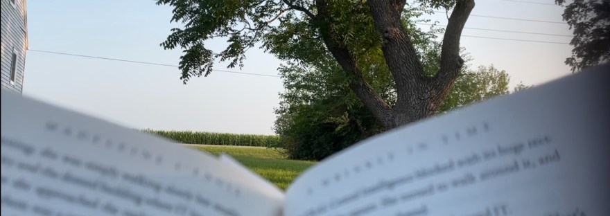 After we came home, I changed my clothes, and went over to my parents’ barn. On Sunday mornings, I usually clean out my dad’s donkeys’ stalls to give him a break, and to get enough hay down to last a week so he doesn’t have to climb up the ladder into the hay mow too often. I love physical labor sometimes, and going over once a week to sweat/work a little and try to tame some of the barn cats is something I look forward to most weeks. After that, I got cleaned up and went to rehearsal for the community theatre musical I’m in, where I got to sing and act and dance a little with some really lovely people. Then I came home again and The Bearded One and I made ourselves some dinner and started watching something new on Netflix. After dinner, I took the dog out for a while. I sat outside in a comfy chair in the shade of my umbrella cart and read a book while my dog sniffed around, the cicadas buzzed, and the birds sang. I got a phone call from my uncle, and we chatted for a few minutes about various things. Then, The Bearded One and I watched a little more of the movie we’d started. And now I’m lying on our comfy couch, typing on my laptop, with my dog snoring next to me.