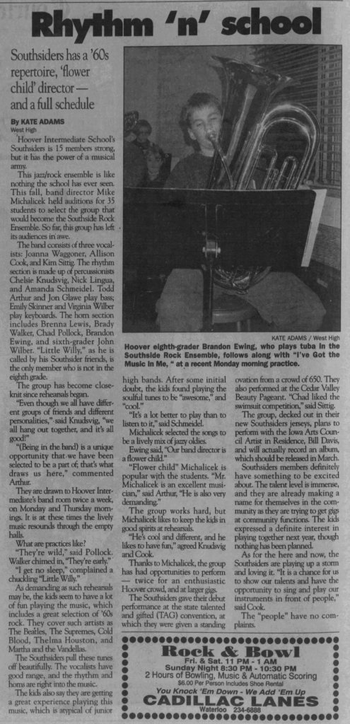 Checker did things like count off a song with, “1…2…up-your-nose-with-a-rubber-hose!” He made one of the practice rooms into what we called “The Living Room” with an easy chair, a rug, and a lamp made out of a bassoon. And he let awkward, midwestern, (barely) teenagers perform songs like Heat Wave (Martha and the Vandellas), and Got to Get You Into My Life (The Beatles), and Low Rider (War). All these songs from the 60’s & 70’s with soul that we probably never had a chance of covering adequately, but we played them anyway. And we loved it–we felt like rock stars. I did, anyway. I don’t remember where all Southsiders played, but I know that once we played at the local hockey rink for about 650 teachers from all over Iowa who were in town for a TAG convention. I, in my nerdy librarian-ness, have a subscription to a website that has digitized copies of newspaper archives, where I found this article about Southsiders: