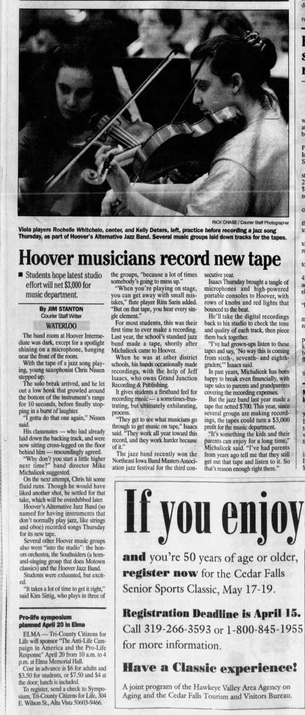 And even beyond all of that, Checker had a local recording studio come in so we could make an album. Each of the groups he directed (and our orchestra) had tracks on this album, which was produced on cassettes (because it was 1996) and sold with the proceeds going to support the school music department. I remember at least one VERY long day in that middle school band room, playing, and singing, and watching while my class/bandmates recorded their solos. Through that whole process I don’t remember Checker ever getting grumpy or snapping at kids. It just wasn’t his nature. He wanted to have fun, he wanted us to have fun, and he wanted to bring out the confident musician in all of us. Here’s another article I found, this one about our recording experience: