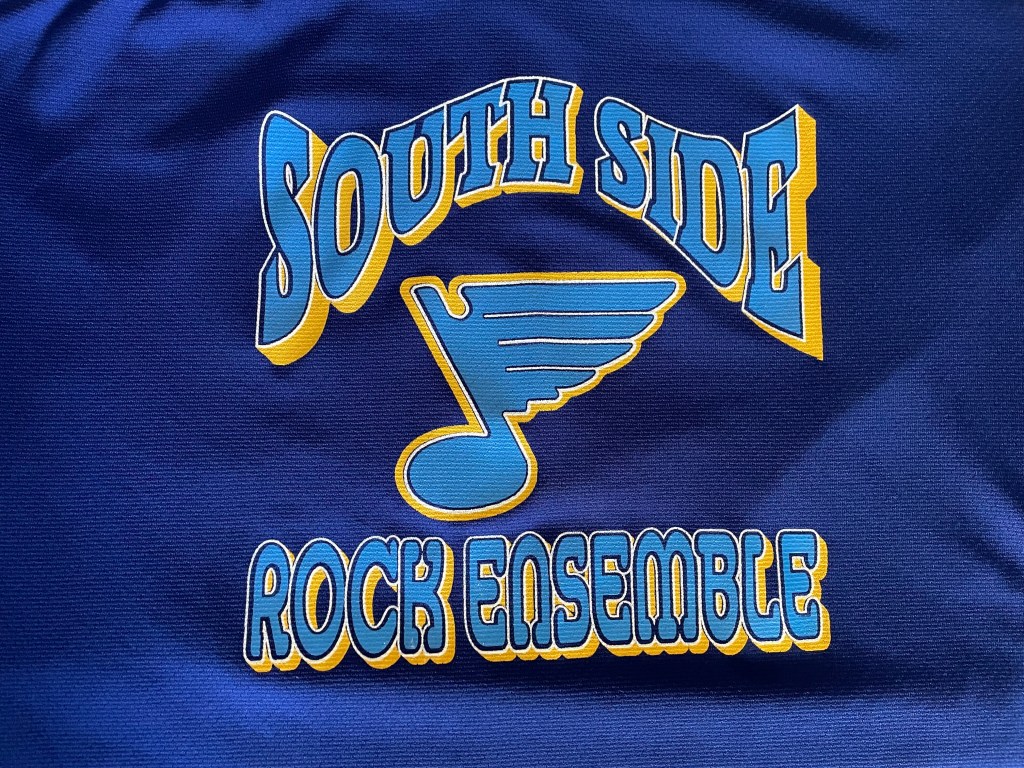 In my 8th grade year, Checker not only directed the regular middle school concert and jazz bands, he also created an “Alternative Jazz Band” in which kids who played any instrument could join to play jazz music. In addition to all of that, he organized the “South Side Rock Ensemble”, which most of us called “Southsiders”. I was one of the lucky ones who got to play in all of those groups. I played French horn in concert band and alternative jazz band, trumpet in regular jazz band, and I sang and occasionally played trumpet or cowbell in Southsiders. I had an absolute blast at an age that could have been really challenging. Take in my awkwardness in the picture at the top of the page singing with Southsiders. We all got cool hockey jerseys to wear when we performed–my mom found mine in my childhood bedroom closet for me: