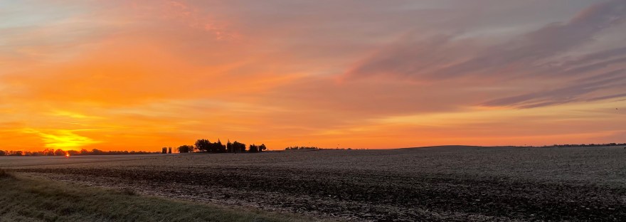 Have you ever seen something, but because of the circumstances you couldn’t quite figure out what it was, or what was happening? The other night, after a pretty long day, I took the dog out for a walk. She was bored because she’d been cooped up most of the day while The Bearded One and I were at work (and I was in class), and I was a little stressed out because group work in grad school isn’t much different than group work in any other forum. So, even though it was about 7:00pm, long after dark this time of year, we went out wandering. We live in the country, kind of, but there is a neighborhood less than a half mile up the road to the east, and we often walk/run there. So, we made it to the neighborhood, and had just turned around to come home when I saw lights up at the cemetery. This cemetery is on the outskirts of the southwest side of the neighborhood–there’s a gravel road that leads to it from the east, but no other paths to or from it, and it’s set apart a bit, so it’s kind of just in the middle of a farm field. The cemetery is actually featured in a lot of the pictures I use in this blog, like the one up above–it’s that clump of trees next to the rising sun.