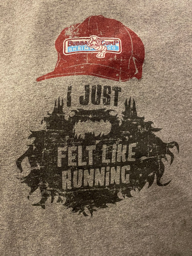 Last week I wrote about the end of my run streak. It’s been two weeks since it ended now, and I’m still feeling okay about that. There was one day that I put on a t-shirt that says, “I just felt like running” (see below). I’d gotten it to celebrate my “Gump Day” (the day in my run streak that matched the number of days Forrest Gump ran in the movie). I hesitated before I put it on, wondering for just a second if I deserved to wear it. Then I realized that was a stupid thought to have–for one, I’m guessing most of the people who buy that t-shirt don’t even know what a run streak is. And two, I achieved my Gump Day–ending my streak doesn’t negate that. I can still celebrate that I did it.
